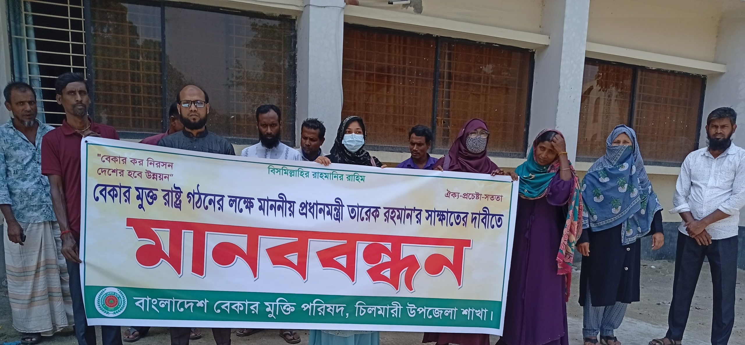 সারা দেশের ন্যায় কুড়িগ্রামের চিলমারীতে "বাংলাদেশ বেকার মুক্তি পরিষদ" এর আয়োজনে মানববন্ধন অনুষ্ঠিত হয়েছে। রবিবার (১২ই এপ্রিল) সকাল ১১টার দিকে উপজেলা পরিষদ চত্বরের সামনে, "বাংলাদেশ বেকার মুক্তি পরিষদ" চিলমারী উপজেলা শাখার সভাপতি জয়নব খাতুনের সভাপতিত্বে "মাননীয় প্রধানমন্ত্রী তারেক রহমানের সাক্ষাতের দাবিতে" মানববন্ধন অনুষ্ঠিত হয়েছে।